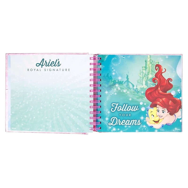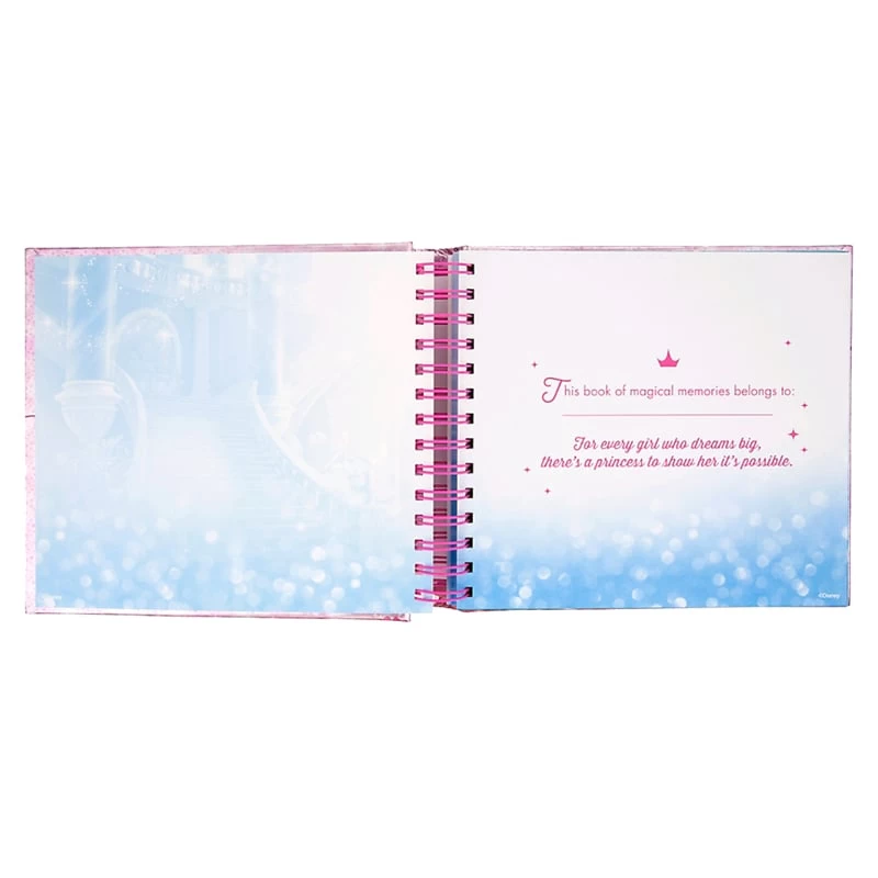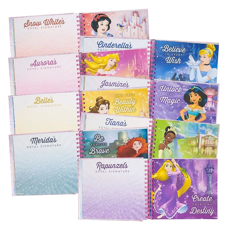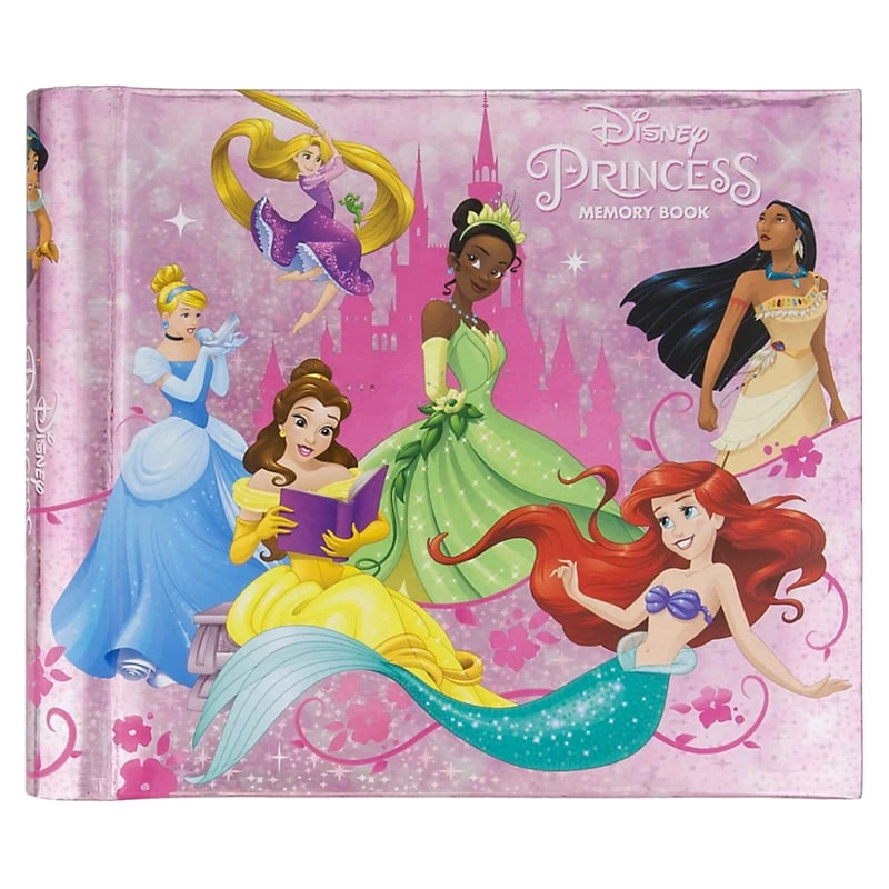 - Glittering padded cover includes Snow White, Cinderella, Aurora, Ariel, Belle, Jasmine, Rapunzel, Tiana, Pocahontas, Mulan, and Merida