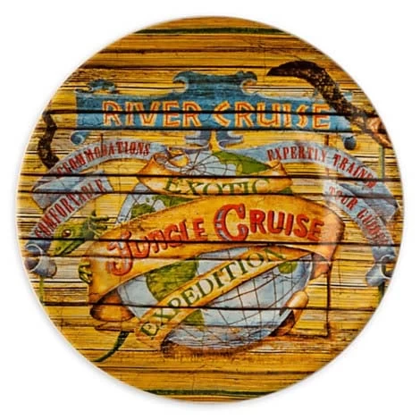 While on safari, dish out a bite or two on this adventurous appetizer plate illustrated with alluring signage as seen at Disney’s classic Jungle Cruise attraction.