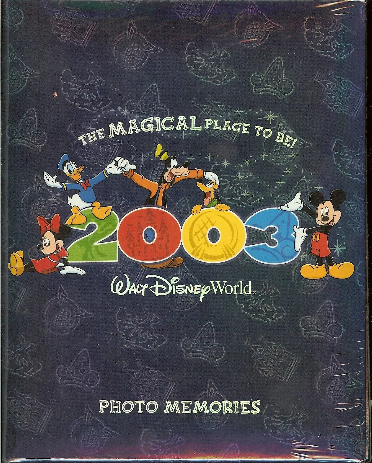 This photo album will hold 100 4 x 6 pictures. The background is metallic blue and features Mickey and friends and the 2003 “The MAGICAL Place to be!” logo on the cover of the album.