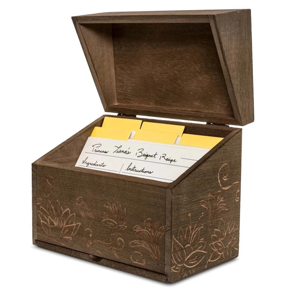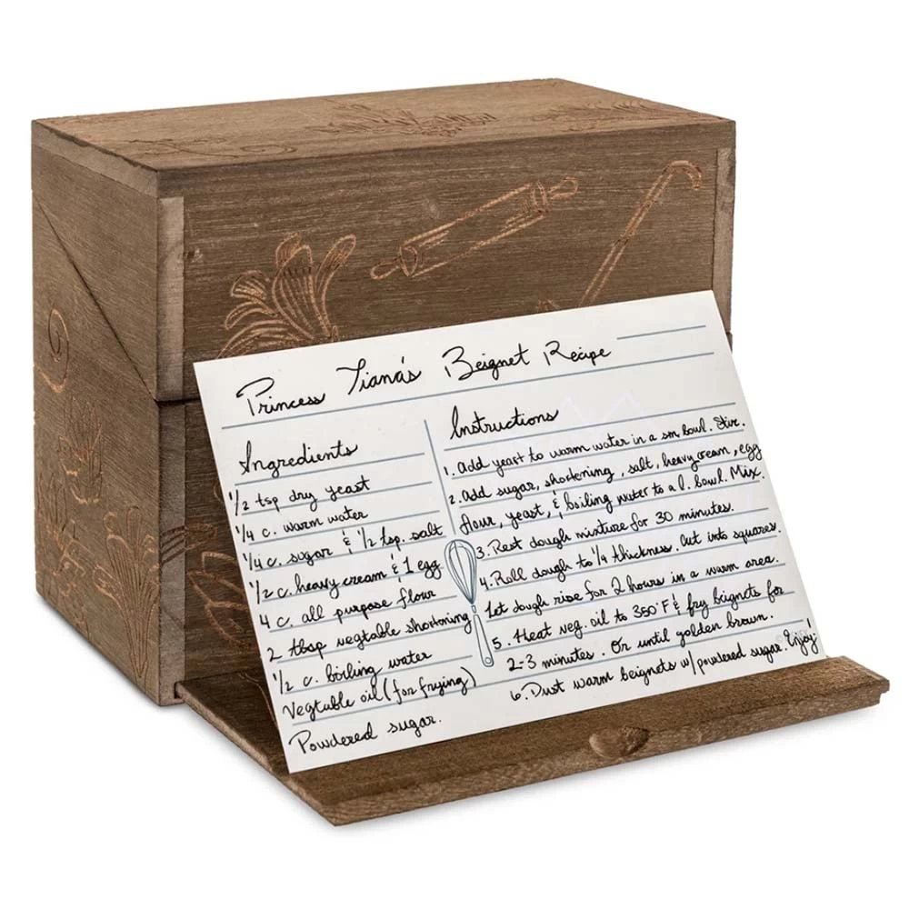 Store all your delicious recipes in this wooden recipe box inspired by Disney’s The Princess and the Frog. This set includes engraved recipe box complete with pull out shelf, 25 recipe cards, and five divider cards so you can stay organized in style.