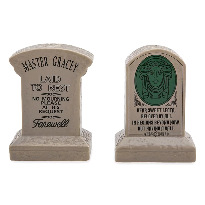Shake up your tabletop style with this Haunted Mansion Tombstone Salt and Pepper Set. Featuring the headstones of Madame Leota and Master Gracey prepared to season your meals in spirited fashion, this set is sure to liven up every culinary occasion!