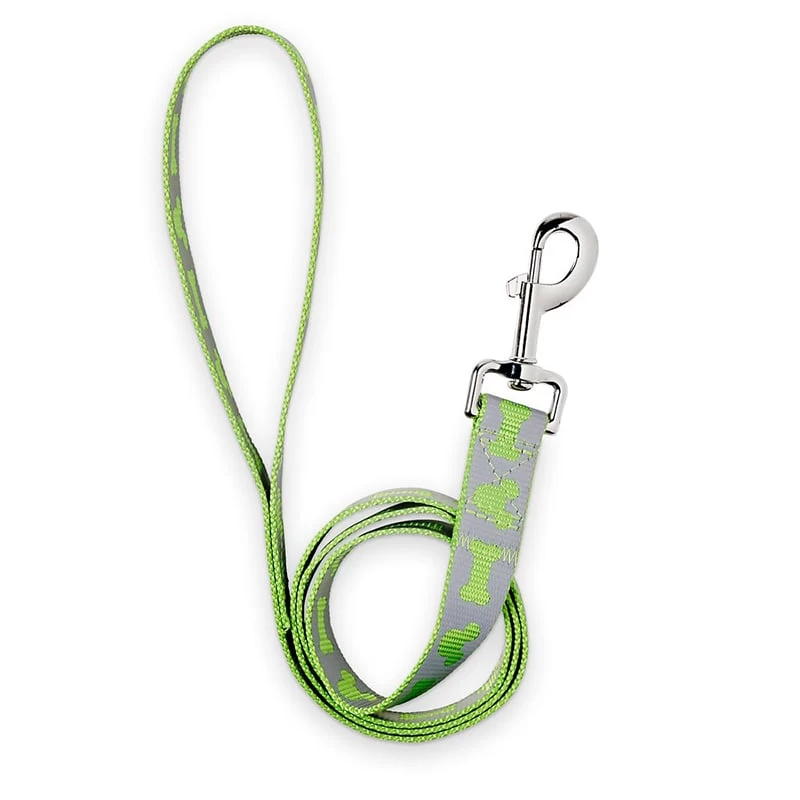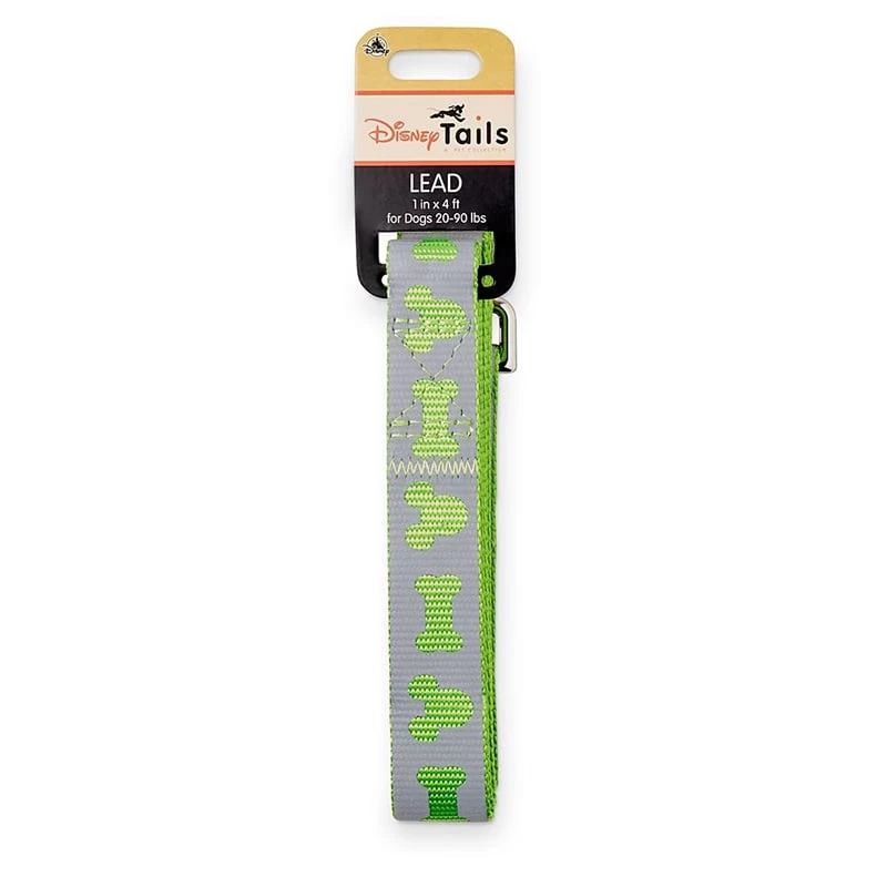Walks will always be more fun in the company of Mickey whose iconic silhouette is cut into the reflection fabric on this sturdy green nylon dog leash, which features silvertone metal hardware.