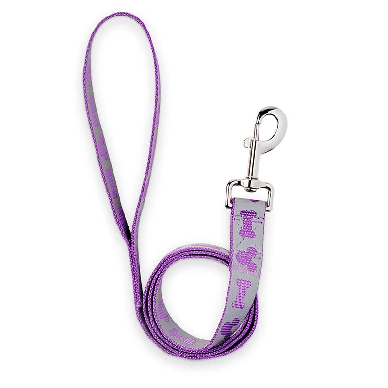 Walks will always be more fun in the company of Mickey whose iconic silhouette is cut into the reflection fabric on this sturdy purple nylon dog leash, which features silvertone metal hardware.