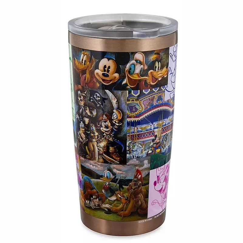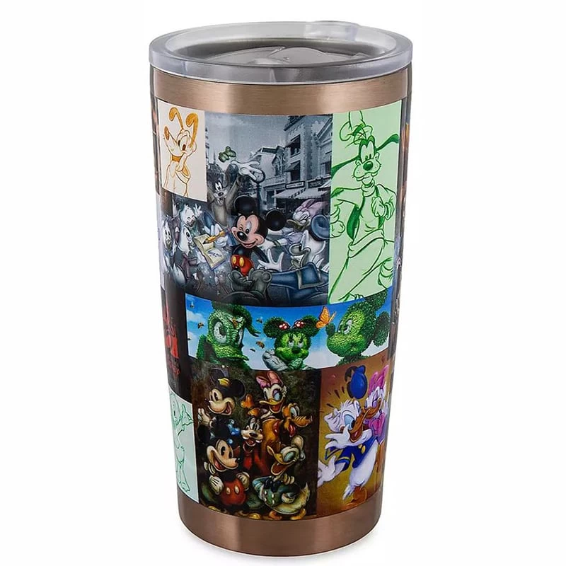 Enjoy refreshing artwork featuring Mickey and his friends on this travel tumbler. Each tile in the allover mosaic design picturing Mickey, Minnie, Donald, Pluto, Goofy and more, is a piece of artwork that has been produced by Disney Parks artists over the years.