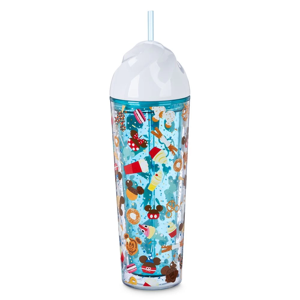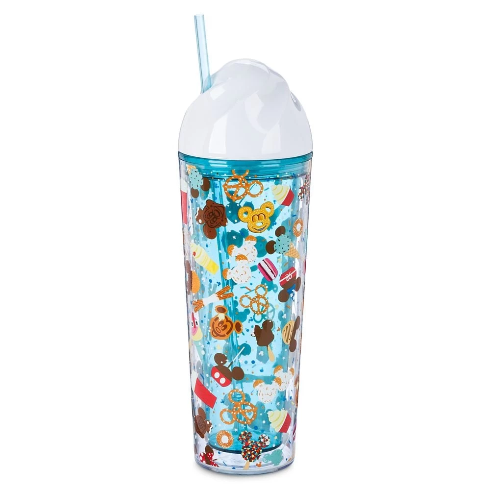 You’ll be sweet on this novel tumbler with its mouthwatering artwork featuring all your favorite Disney Parks treats. The double-walled design features a blue translucent inner wall while the clear outer wall is covered in colorful images of such yummy delights as Mickey ice cream sandwiches, Mickey waffles, pineapple swirls, churros and Mickey pretzels. The lid is shaped like a swirl of white ice cream and holds a reusable straw.