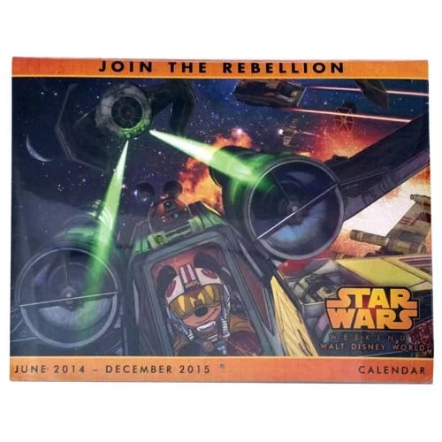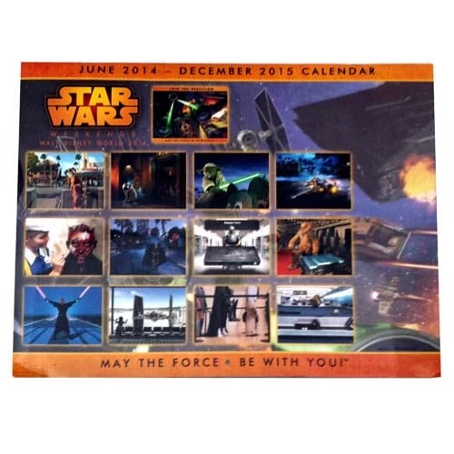 Go on vacation with Star Wars at Disney! This wall calendar features the Star Wars Weekends 2014 poster logo and art depicting Star Wars characters on vacation, Disney style!
